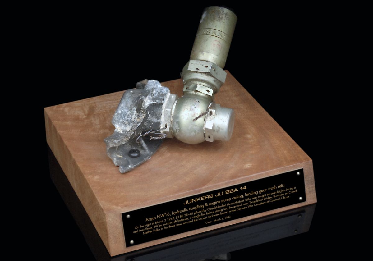 This original Luftwaffe artefact comes mounted on its 100 yr mango wood display stand with engraved plaque and an awesomely detailed 1/72 or larger 1/48 scale custom built model of this key Luftwaffe bomber mounted above on its magnetic stand. A double sided, laminated detailed Fact Sheet is also supplied featuring details of Falke's JU 88 and the hydraulic coupling making this the perfect gift for any pilot or aviation enthusiast.