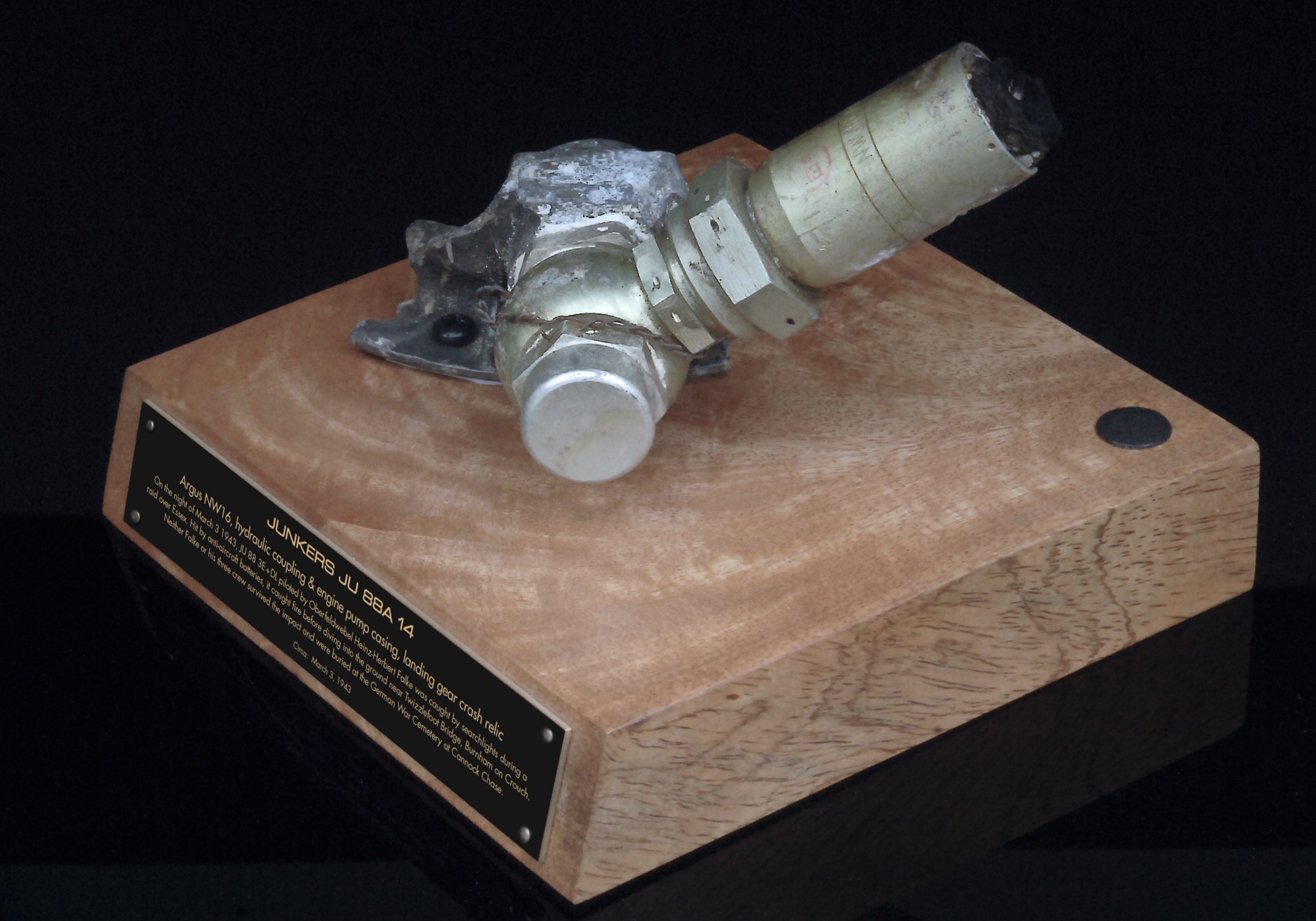 Your JU-88 3E+DL landing gear hydraulic coupling, Original Recovery Curios Warbird Collectable includes:
