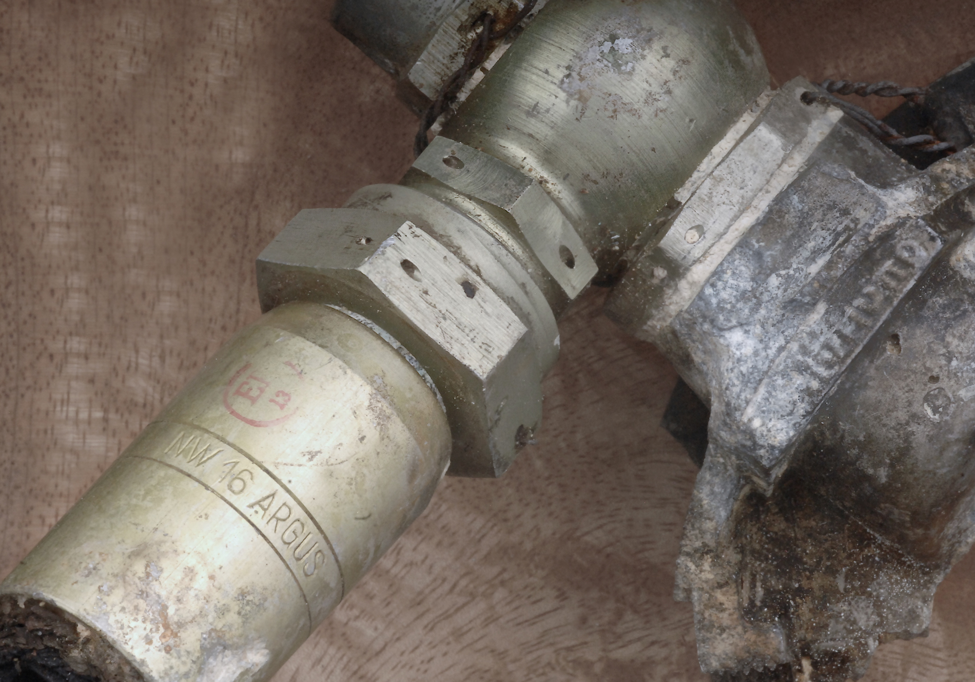Whilst some major pieces were put on local display, many of the JU88’s recovered pieces went into private collections such as this complete Argus NW16 double flange adapter, hydraulic coupling and pump casing remnant was also recovered with the landing gear strut.